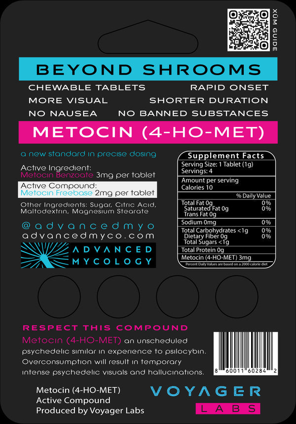Each tablet contains 3mg of Metocin (4-HO-MET), equivalent to eating 500mg of shrooms.